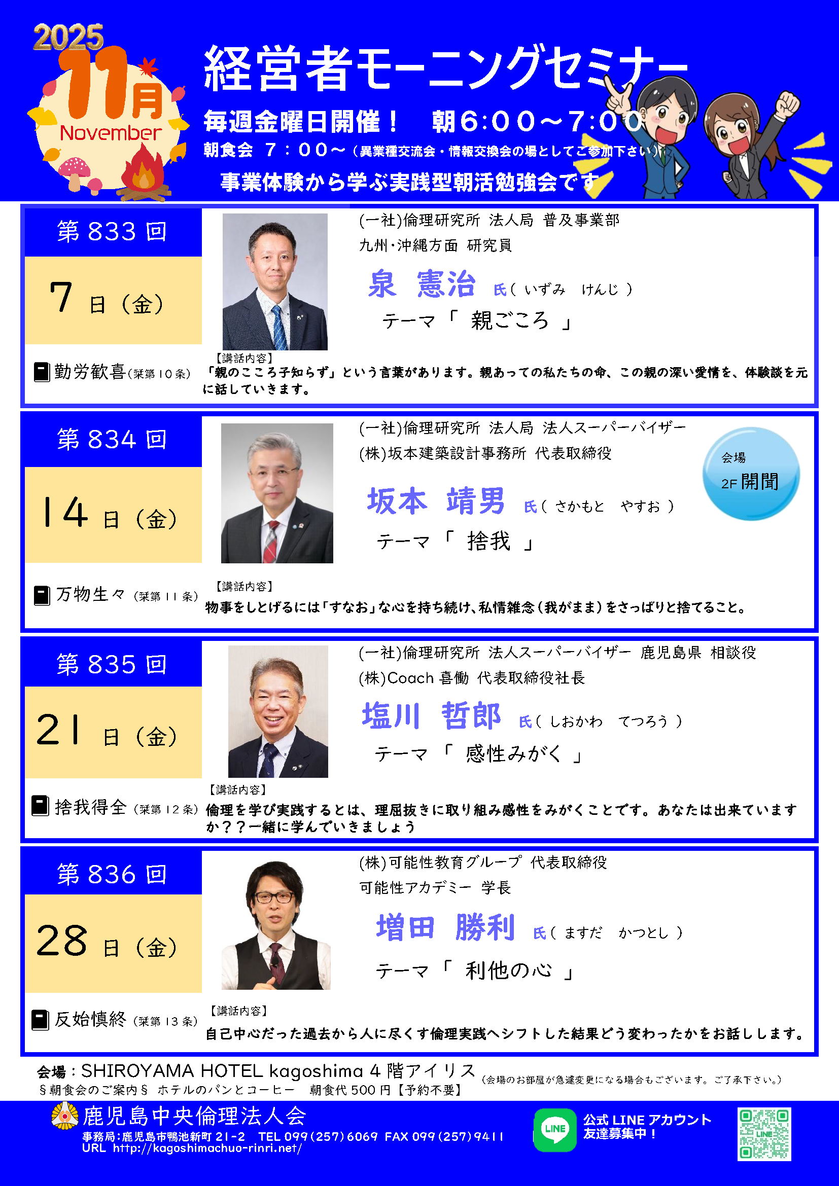 令和7年11月の鹿児島中央倫理法人会経営者モーニングセミナーの予定表です
